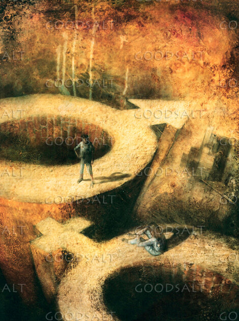 A man and a woman appear separated as they are on their respective gender symbol by Lars Justinen