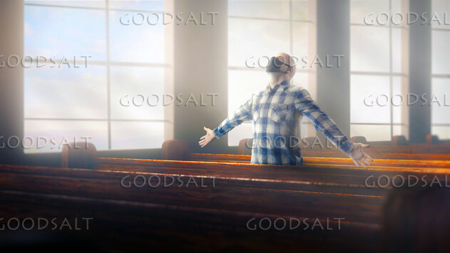 A man alone in church with a mask and in worship. by Kevin Carden