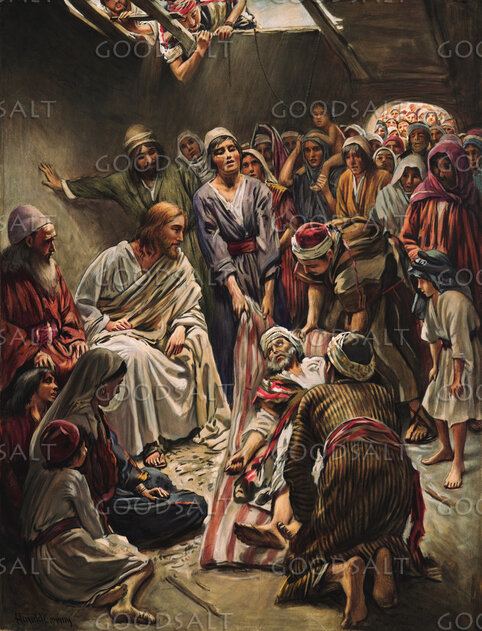 Luke 517 On one of those days, as he was teaching, Pharisees and teachers of the law were sitting there, who had come from every village of Galilee and Judea and from Jerusalem. And the power of the Lord was with him to heal.18 And behold, some men were bringing on a bed a man who was paralyzed, and they were seeking to bring him in and lay him before Jesus,19 but finding no way to bring him in, because of the crowd, they went up on the roof and let him down with his bed through the tiles into the midst before Jesus.20 And when he saw their faith, he said, “Man, your sins are forgiven you.”21 And the scribes and the Pharisees began to question, saying, “Who is this who speaks blasphemies? Who can forgive sins but God alone?”22 When Jesus perceived their thoughts, he answered them, “Why do you question in your hearts?23 Which is easier, to say, ‘Your sins are forgiven you,’ or to say, ‘Rise and walk’?24 But that you may know that the Son of Man has authority on earth to forgive sins”—he said to the man who was paralyzed—“I say to you, rise, pick up your bed and go home.”25 And immediately he rose up before them and picked up what he had been lying on and went home, glorifying God.26 And amazement seized them all, and they glorified God and were filled with awe, saying, “We have seen extraordinary things today.” Mark 21 And when he returned to Capernaum after some days, it was reported that he was at home.2 And many were gathered together, so that there was no more room, not even at the door. And he was preaching the word to them.3 And they came, bringing to him a paralytic carried by four men.4 And when they could not get near him because of the crowd, they removed the roof above him, and when they had made an opening, they let down the bed on which the paralytic lay.5 And when Jesus saw their faith, he said to the paralytic, “Son, your sins are forgiven.”6 Now some of the scribes were sitting there, questioning in their hearts,7 “Why does this man speak like that? He is blaspheming! Who can forgive sins but God alone?”8 And immediately Jesus, perceiving in his spirit that they thus questioned within themselves, said to them, “Why do you question these things in your hearts?9 Which is easier, to say to the paralytic, ‘Your sins are forgiven,’ or to say, ‘Rise, take up your bed and walk’?10 But that you may know that the Son of Man has authority on earth to forgive sins”—he said to the paralytic—11 “I say to you, rise, pick up your bed, and go home.”12 And he rose and immediately picked up his bed and went out before them all, so that they were all amazed and glorified God, saying, “We never saw anything like this!” Matthew 91 And getting into a boat he crossed over and came to his own city.2 And behold, some people brought to him a paralytic, lying on a bed. And when Jesus saw their faith, he said to the paralytic, “Take heart, my son; your sins are forgiven.”3 And behold, some of the scribes said to themselves, “This man is blaspheming.”4 But Jesus, knowing their thoughts, said, “Why do you think evil in your hearts?5 For which is easier, to say, ‘Your sins are forgiven,’ or to say, ‘Rise and walk’?6 But that you may know that the Son of Man has authority on earth to forgive sins”—he then said to the paralytic—“Rise, pick up your bed and go home.”7 And he rose and went home.8 When the crowds saw it, they were afraid, and they glorified God, who had given such authority to men. | |