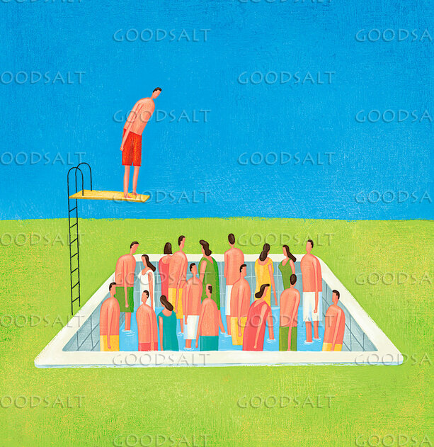 Man on Diving Board Jumping Into Pool Full of People but No