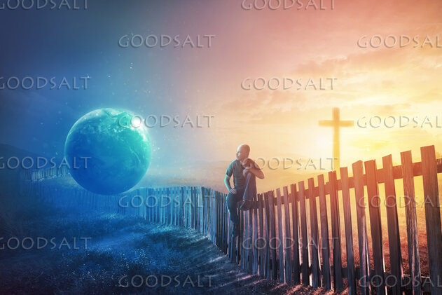 A man sits on a fence undecided between the earth and the cross. by Kevin Carden