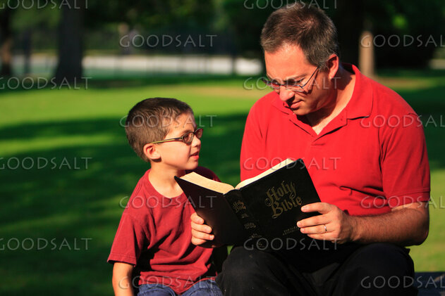 5. Man reading Bible to little boy in park in summer.