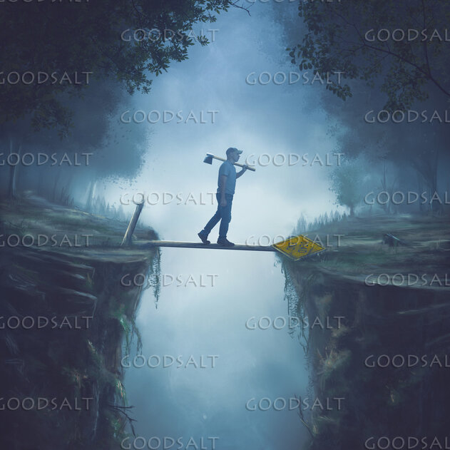 Digital painting of a man walking over a cliff after chopping down a dead end sign. by Kevin Carden