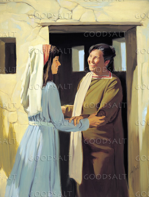 Elizabeth greeting Mary at the door to Elizabeth's house. by Lifeway Collection