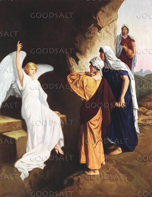 1 When the Sabbath was past, Mary Magdalene and Mary the mother of James and Salome bought spices, so that they might go and anoint him.2 And very early on the first day of the week, when the sun had risen, they went to the tomb.3 And they were saying to one another, “Who will roll away the stone for us from the entrance of the tomb?”4 And looking up, they saw that the stone had been rolled back—it was very large.5 And entering the tomb, they saw a young man sitting on the right side, dressed in a white robe, and they were alarmed.6 And he said to them, “Do not be alarmed. You seek Jesus of Nazareth, who was crucified. He has risen; he is not here. See the place where they laid him.7 But go, tell his disciples and Peter that he is going before you to Galilee. There you will see him, just as he told you.”