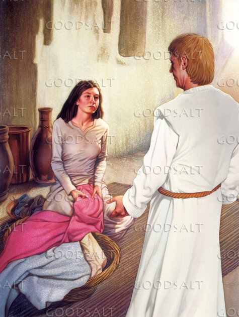Mary, insider her simple home, sits on the floor and hears the message from the angel seen nearby. by Lifeway Collection