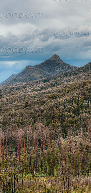 Large rock mountain rises above the damaged and regrowing forests and dead remnants of fire damaged forest. by Mal Austin