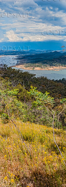 Large lake surrounded by steep rolling hils and forest. by Mal Austin