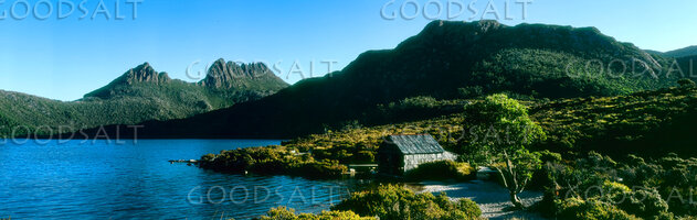 Heritage boat house and small sandy bay on a clear sunny morning below the mountain peaks. by Mal Austin