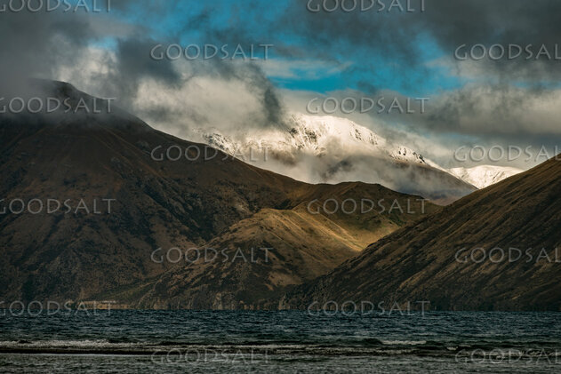 mountains with heavy clouds and snow beside lake by Mal Austin