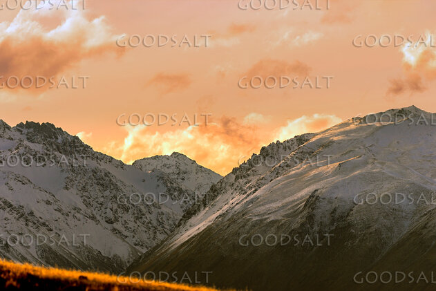 Snowy ranges at dazzling sunset last-light with lingering low clouds. by Mal Austin
