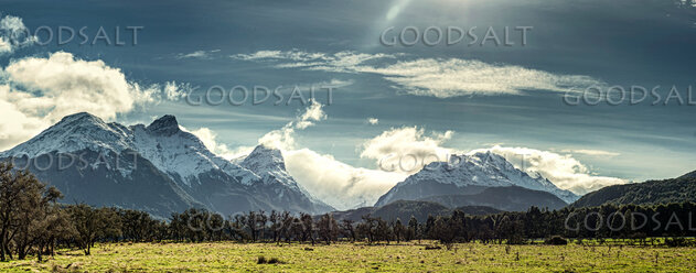 Prominent mountain range with blue sky with grazing land and contorted trees in foreground. by Mal Austin