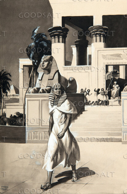 Brownish image of Moses walking in Egypt. He has on a striped royal headdress. He is walking past a stairway with sphinx on either side. In the distant background the king is sitting on a throne.