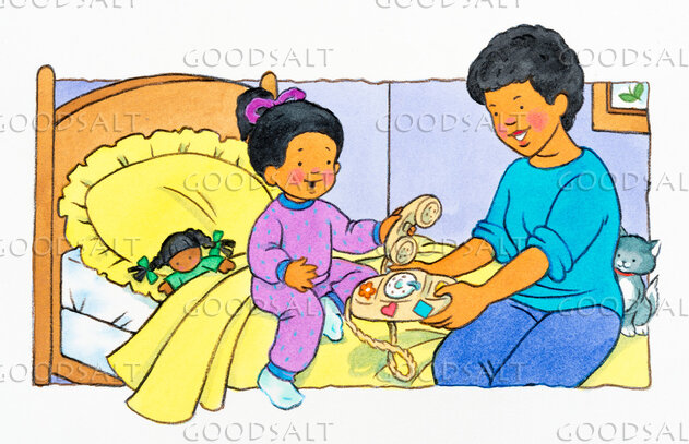 Mother and daughter playing with toy telephone in her bedroom. by Mary Rumford