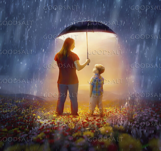 A mother protects her son from the rain with her umbrella. by Kevin Carden