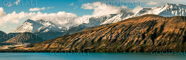 mountains with heavy clouds and snow beside lake by Mal Austin