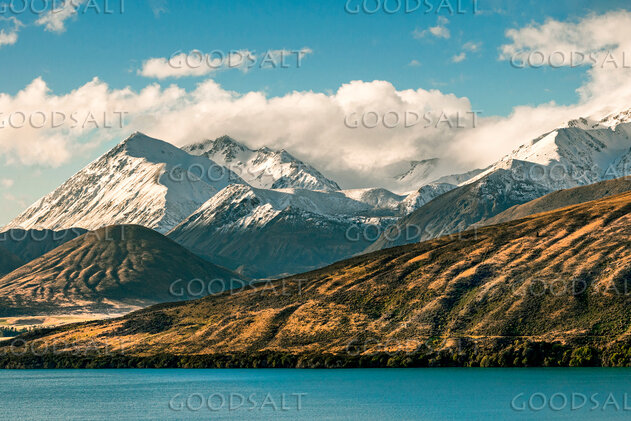 mountains with heavy clouds and snow beside lake by Mal Austin