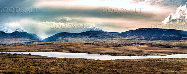 Narrow lake with mountain range behind and an unsettled early morning sky. by Mal Austin