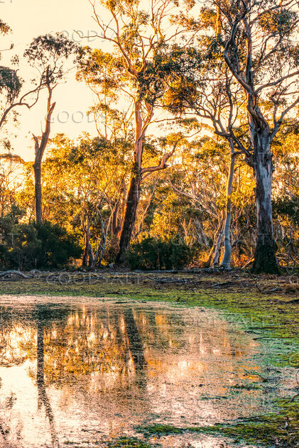 Serenity of the evening stillness and last light on natural waterhole in treed swamp land.