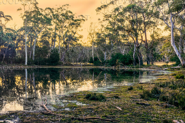 Serenity of the evening stillness and last light on natural waterhole in treed swamp land.