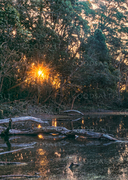 Serenity of the evening stillness and last light on natural waterhole in treed swamp land.