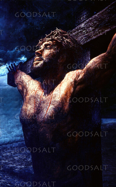 Detail of painting \\\"It Is Accomplished.\\\" Jesus told his disciples, \\\"Greater love has no one than this, that he lay down his life for his friends.\\\" Who can possibly understand this great mystery? Christ bore the weight of every sin that every one of us has ever committed. All of us must face the cross of Christ. Sheer gratitude demands it. Each one must decide if he was truly the Son of God. We don\\\'t have to understand this great love and sacrifice, but only believe in him, receive his great gift, and worship him in love as the Son of the living God, the Christ and Savior of all!