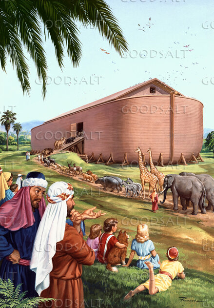 Many animals in groups of two going into Noah\'s ark. by Pacific Press