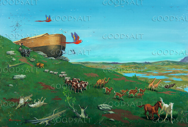 Animals leave the ark after the Great Flood. Ark is perched on the hill as animals leave down green slopes. by Review & Herald Publishing