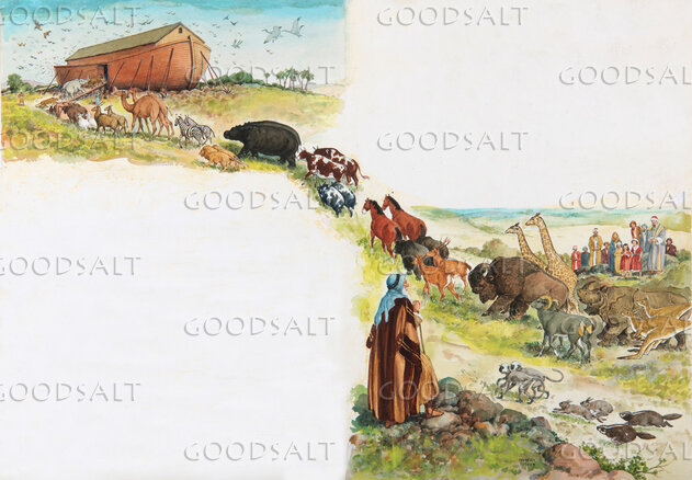 Horizontal style border illustration of Noah watching the animals going two by two into the ark. His family also watches in the distance. The ark is on the top of a hill on the left. Animals proceed from lower right to upper left of page. Double page spread. Watercolor.