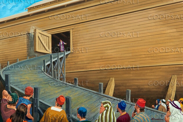 The door to Noah's ark swings closed as Noah pleads with the people for the last time. by Review & Herald Publishing