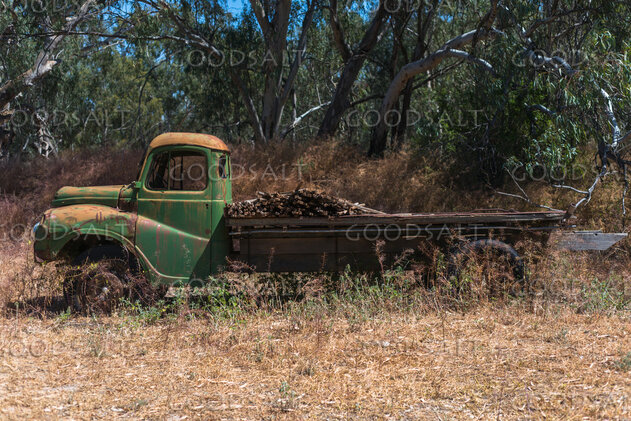 Old Austin tray truck at historic farm property in outback. by Mal Austin