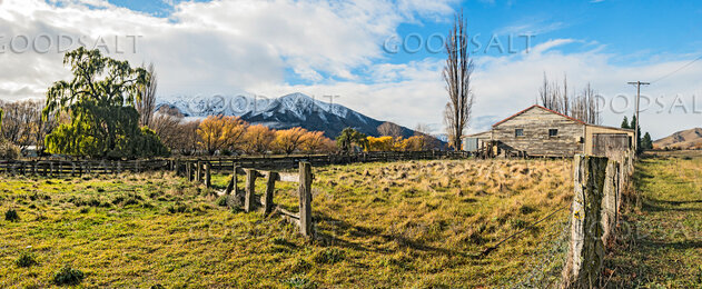 Old barn and sheepyard with snowy mountain at rear. by Mal Austin