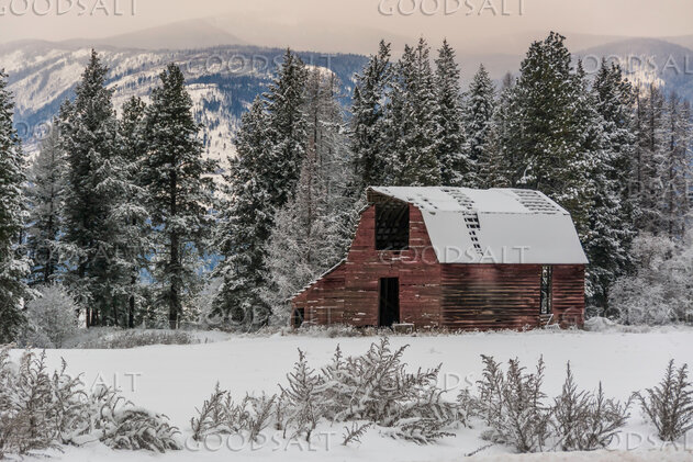 This old barn is nicely set off by snowy and frosty trees and bushes. by Mary Lane Anderson