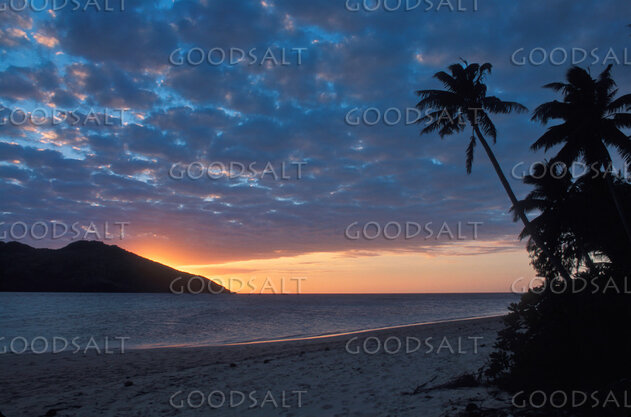 A silhouette of palm trees on a beach while the sun sets behind a mountain in the ocean. by Don Mammoser