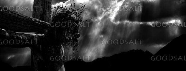 Jesus on cross, B&W image with mountains and dramatic sky in rear by Mal Austin