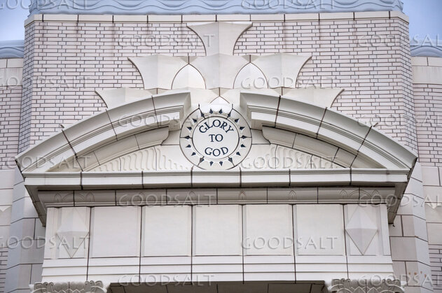 Photo of an element of a church building. It says Glory to God in a center medalian. by Deb Minnard