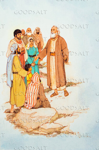 Patriarch talking to group of people and families. Some are sitting and some are standing. by Lifeway Collection