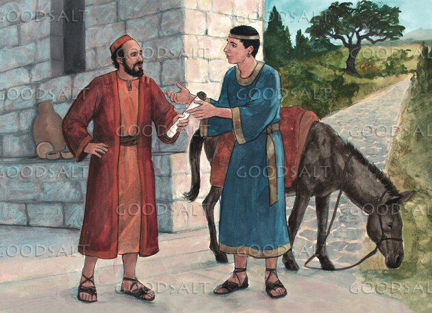 Paul and Onesimus are standing outside a building. Paul is handing a letter to Onesimus and giving him instructions to return to Philemon with the letter that explains Onesimus' return. There is a donkey standing behind Onesimus, giving the impression that he is ready to return to Philemon.
