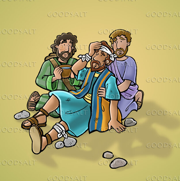 Fellow believers relieve Paul's suffering after having been stoned. Children's division style art. Part of a series. by Kim Justinen