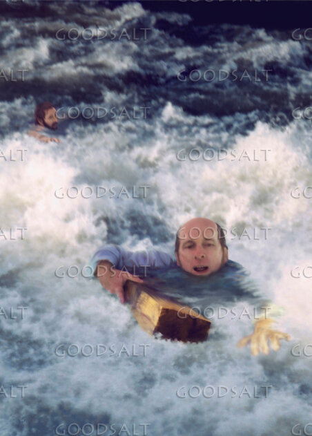 Paul and others are shipwrecked, hanging on boards and broken pieces of the ship to escape to land safely by Darrel Tank