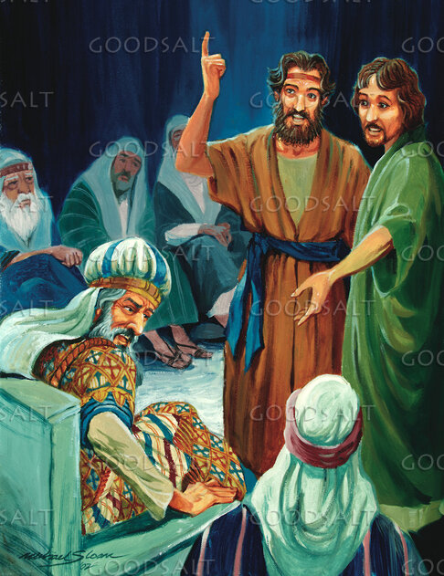 Peter and John are brought before the Sanhedrin. Peter boldly speaks to them about Jesus. by Lifeway Collection