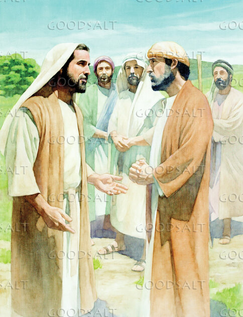 Jesus with Peter ad a few other disciples. Jesus is asking, "Who do people say the Son of Man is?" after which Peter confidently answers, "You are the Messiah."