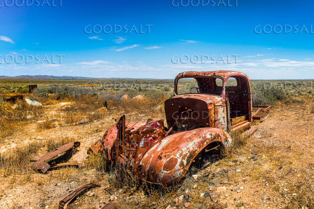 Disappearing pick-up truck wreck in wide and dry desert surroundings. by Mal Austin