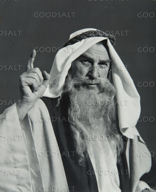 Prophet is pointing toward heaven. He looks serious, has a headdress on, a long beard, and a long robe. Picture is closeup, from waist. Black and white.