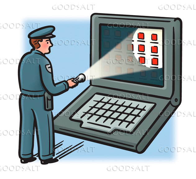 Policeman shining flashlight on monitor screen. by Krieg Barrie
