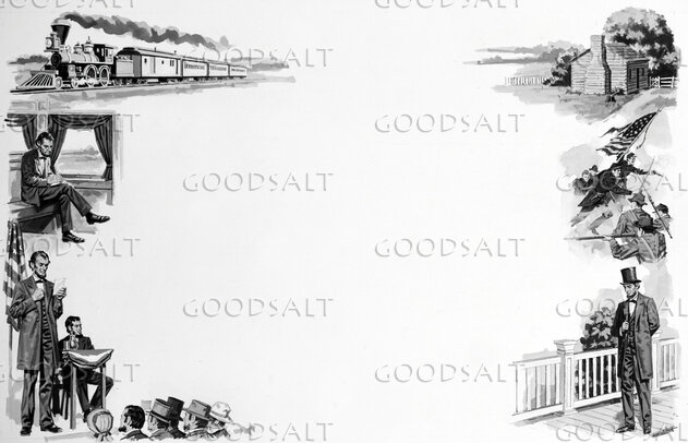 Ideals collection. Black and white illustrations depicting scenes from the life of President Abraham Lincoln. Two page spread. Locomotive. Lincoln seated inside train writing. Lincoln making the Gettysburg address. Log cabin. Revolutionary war with soldiers and tattered American flag. Lincoln in suit top hat on a balcony. Americana.