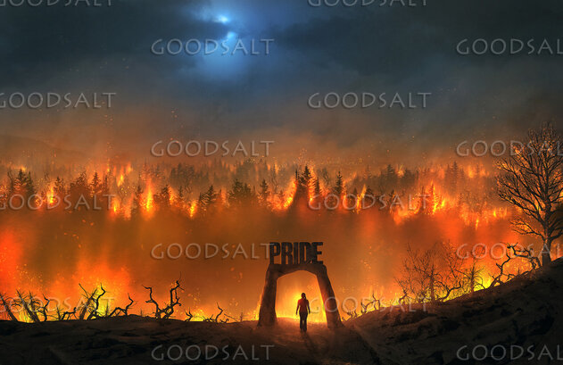 A woman walks through a doorway into a burning forest. by Kevin Carden