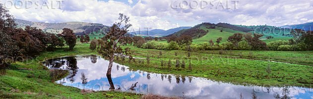 Large farm dam in lush grazing land with reflection of surroundings. by Mal Austin