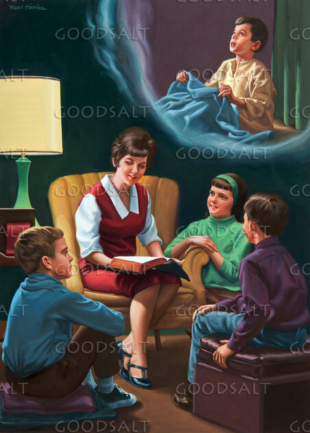 Vintage painting of a family reading about the story of young Samuel by Review & Herald Publishing