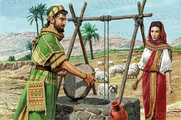 Rachel appears to be walking toward a well where there is a water pot. There is a man at the well, and he is taking the cover off of the well opening. He is looking at Rachel. He is dressed in colorful clothing and is wearing jewelry as if he is rich. In the background, sheep are grazing in a meadow.
